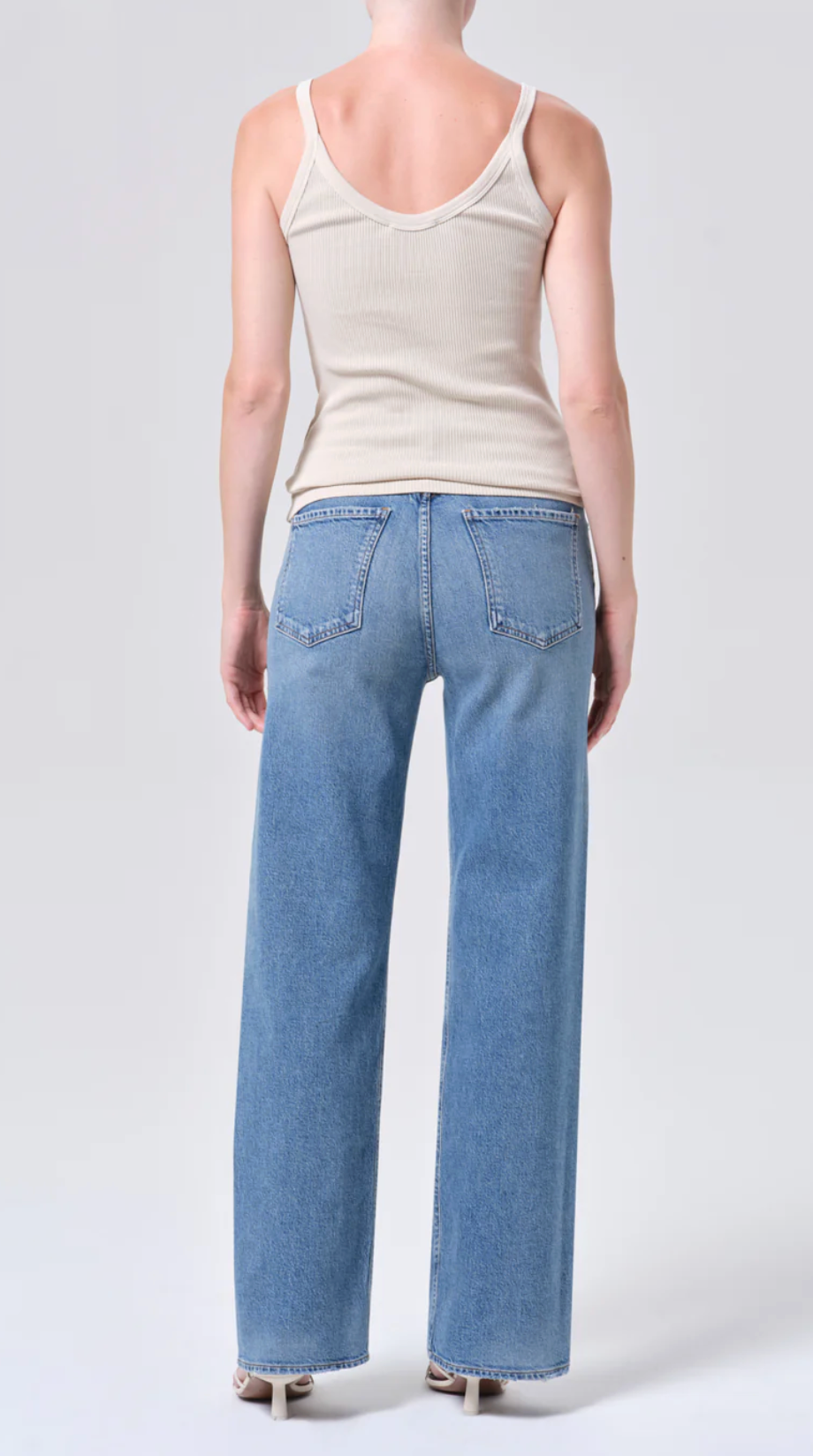 A high-rise wide-leg silhouette, the Ren Jean features a flattering high waist, a relaxed fit through the hips, and an easy, elongated leg shape — now offered in a full-length 32-inch inseam for an even more lengthening effect. Rendered in a medium washed-out tinted indigo, it delivers a soft, lived-in look with everyday versatility. Crafted from soft, breathable regenerative cotton denim blended with EcoMade Fiber for light stretch and natural movement, it offers a comfortable worn-in feeling while maintaining a clean, structured finish.