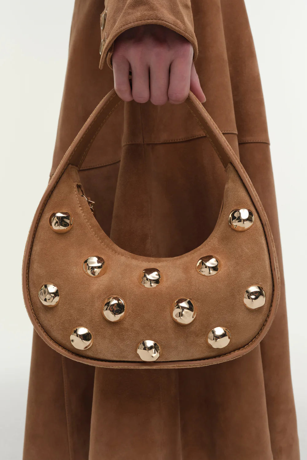 Made from rich suede, this crescent shaped bag is adorned with domed golden studs. The compact silhouette sits neatly under the arm. A sculptural design grounded in craftsmanship.