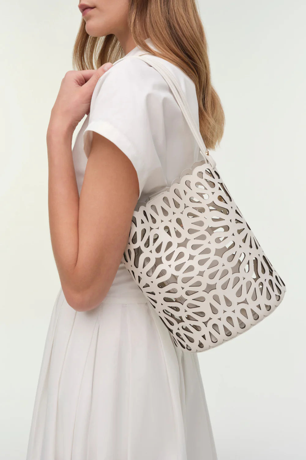 The Mccall Laser Cut Leather Bucket Bag in Cream