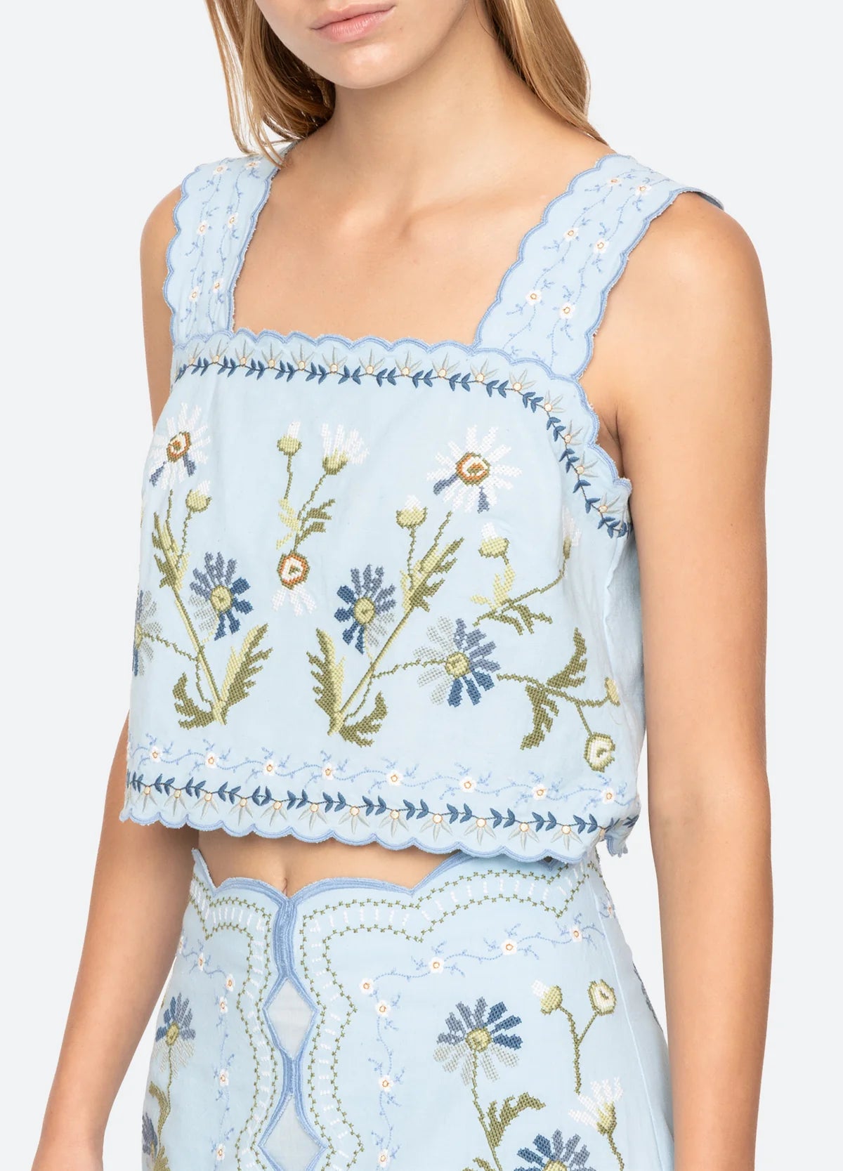 The Audra embroidered tank top features a cropped silhouette with delicate scalloped edges and tie fastening at the back. Adorned with detailed floral embroidery throughout, it offers a feminine and charming finish.