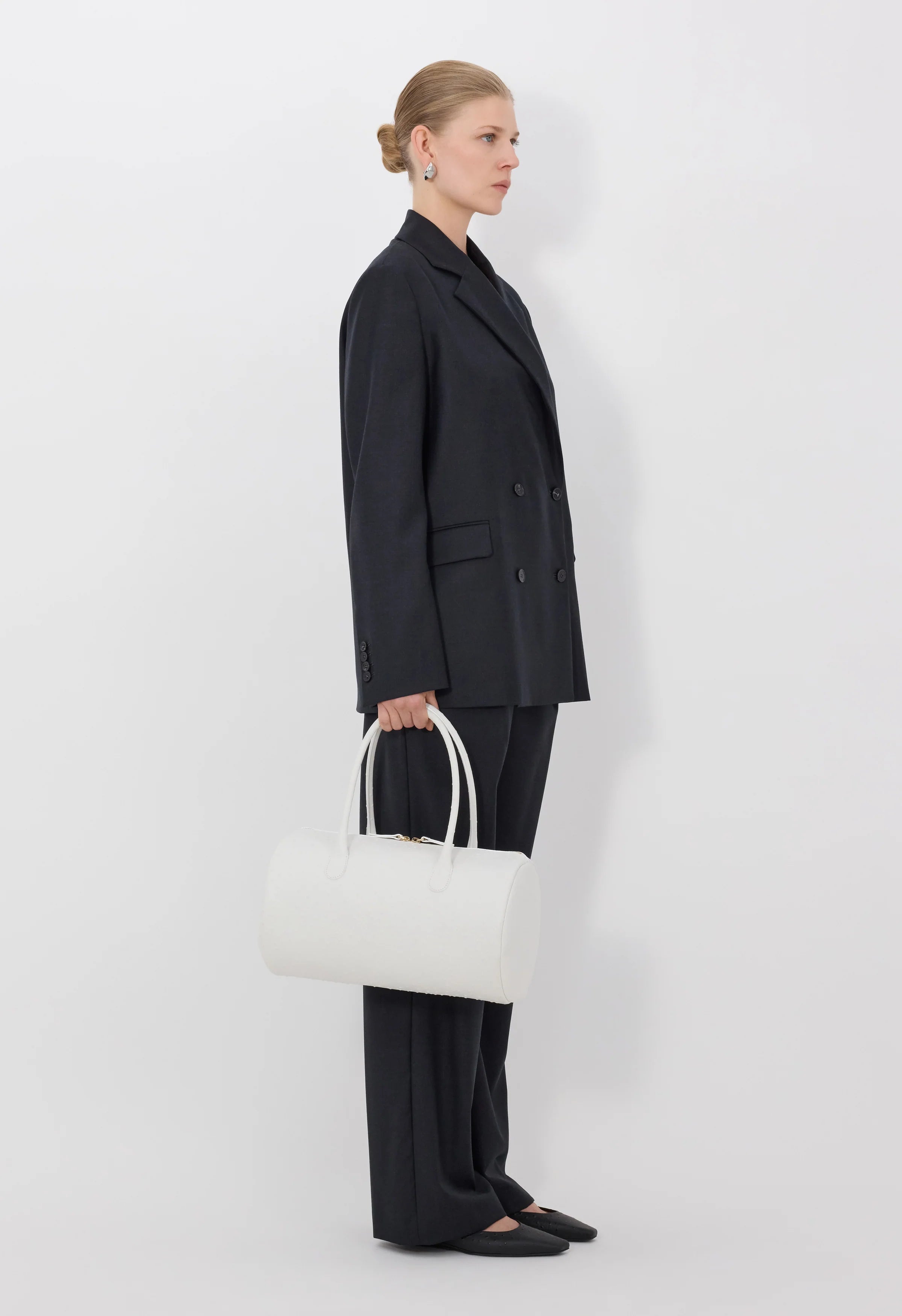 This blazer is made of Super 120s virgin wool with a soft, rounded touch. The fit is generous yet structured thanks to its light shoulder pads and double breasted front opening. Details are borrowed from menswear and include a standard notch lapel, front flap pockets and buttoned cuffs.