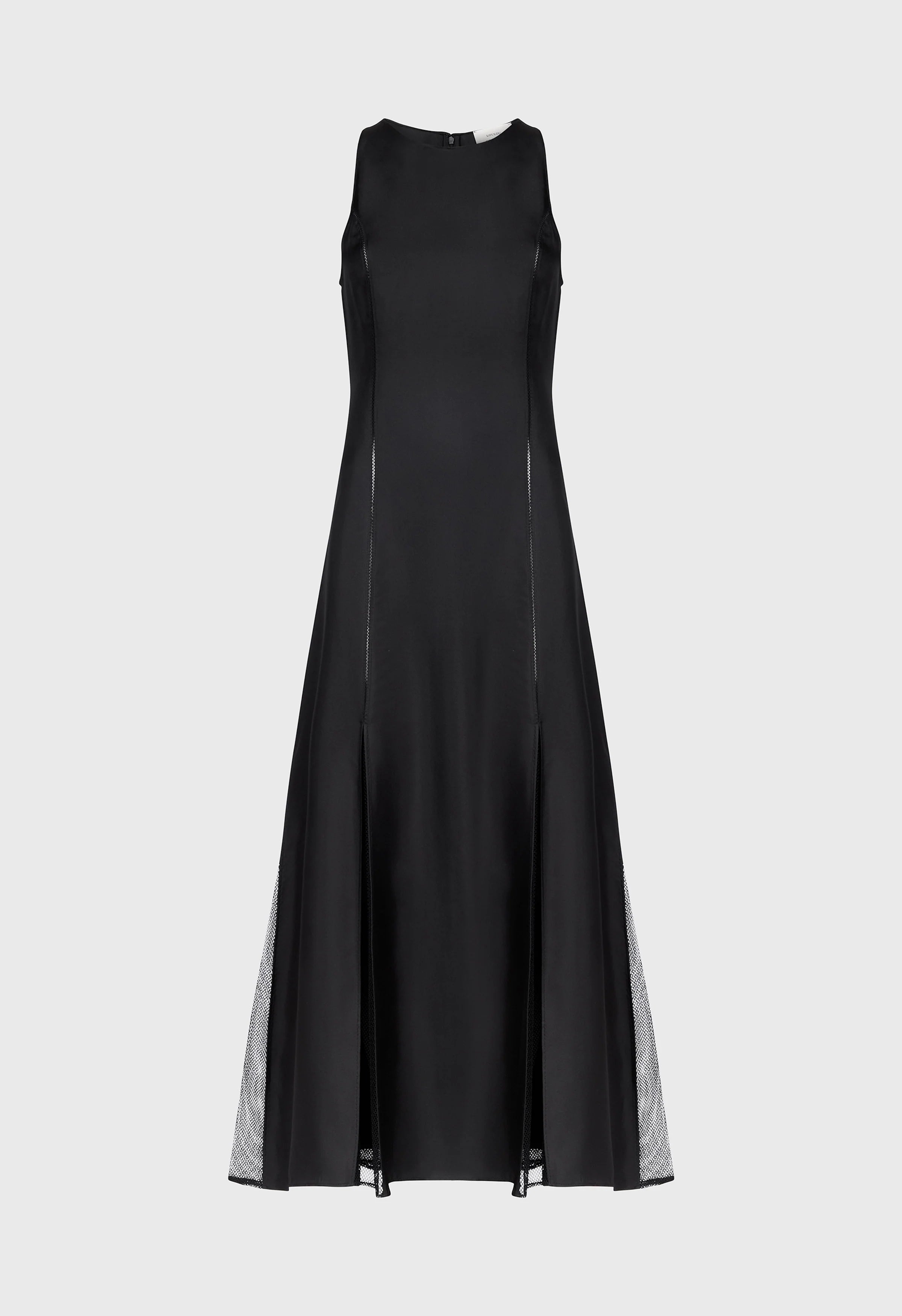This dress is made of silk twill. Its fit is adjusted at the torso and the waistline, featuring a flared midi skirt enhanced by lace-stitching details on the seams and a mesh tulle cut-out that brings lightness and sophistication to the silhouette.