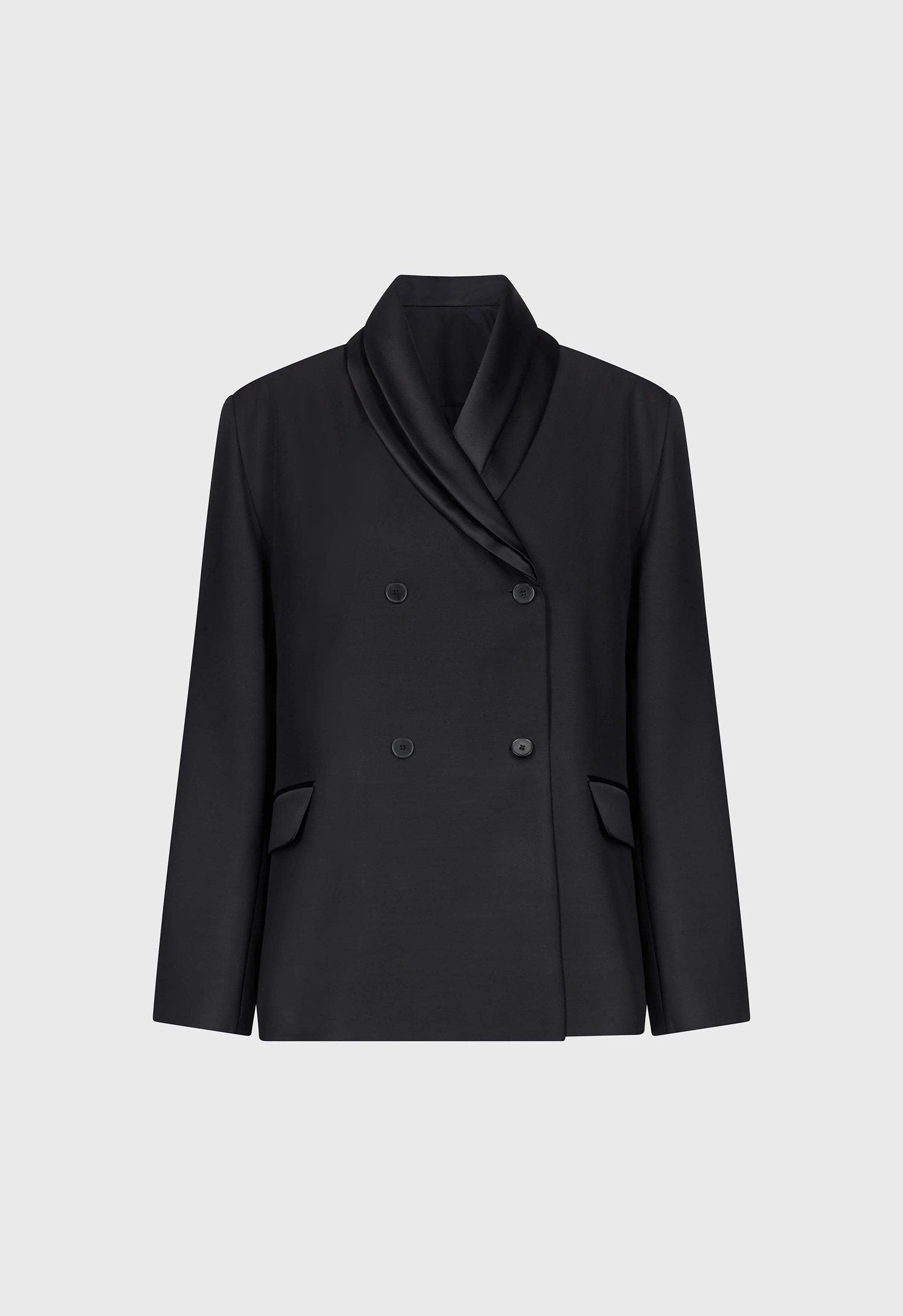This jacket is made of double face satin viscose wool with a delicately shiny finish. Its straight, ample fit is complete with a double breasted buttoning and a draped shawl collar that brings depth to the silhouette. Two side flap pockets complete the details. It can be worn with the Mahoney trousers in the same fabric to create a total look.