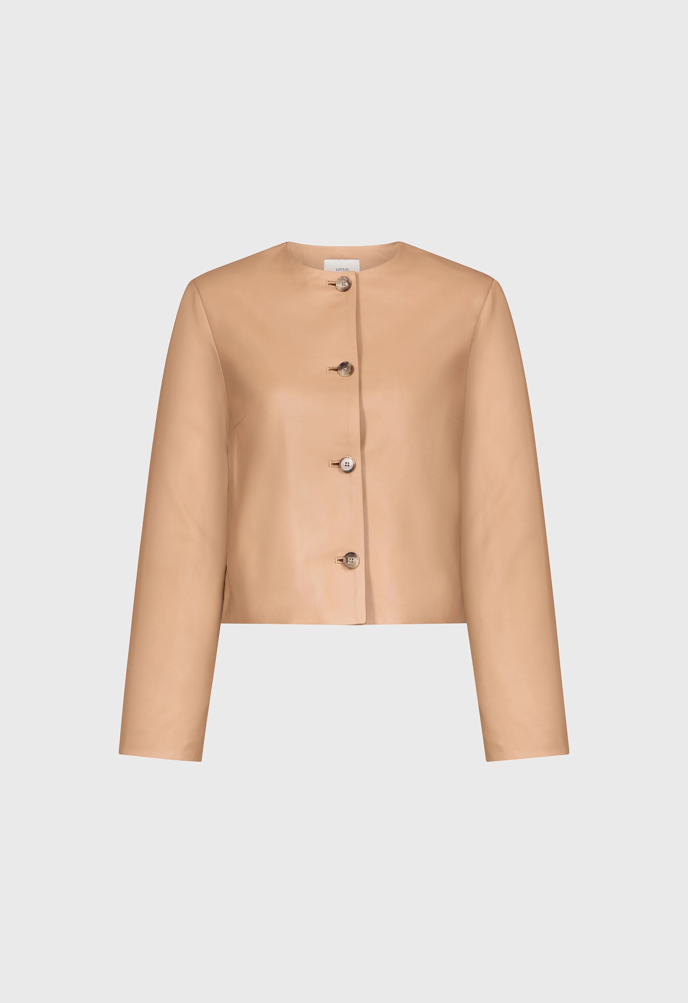 This jacket is made of soft plongé leather. Its slightly cropped, boxy fit conveys a chic, effortless allure. Details are minimal and include a crew neck, long sleeves and a four-button placket.