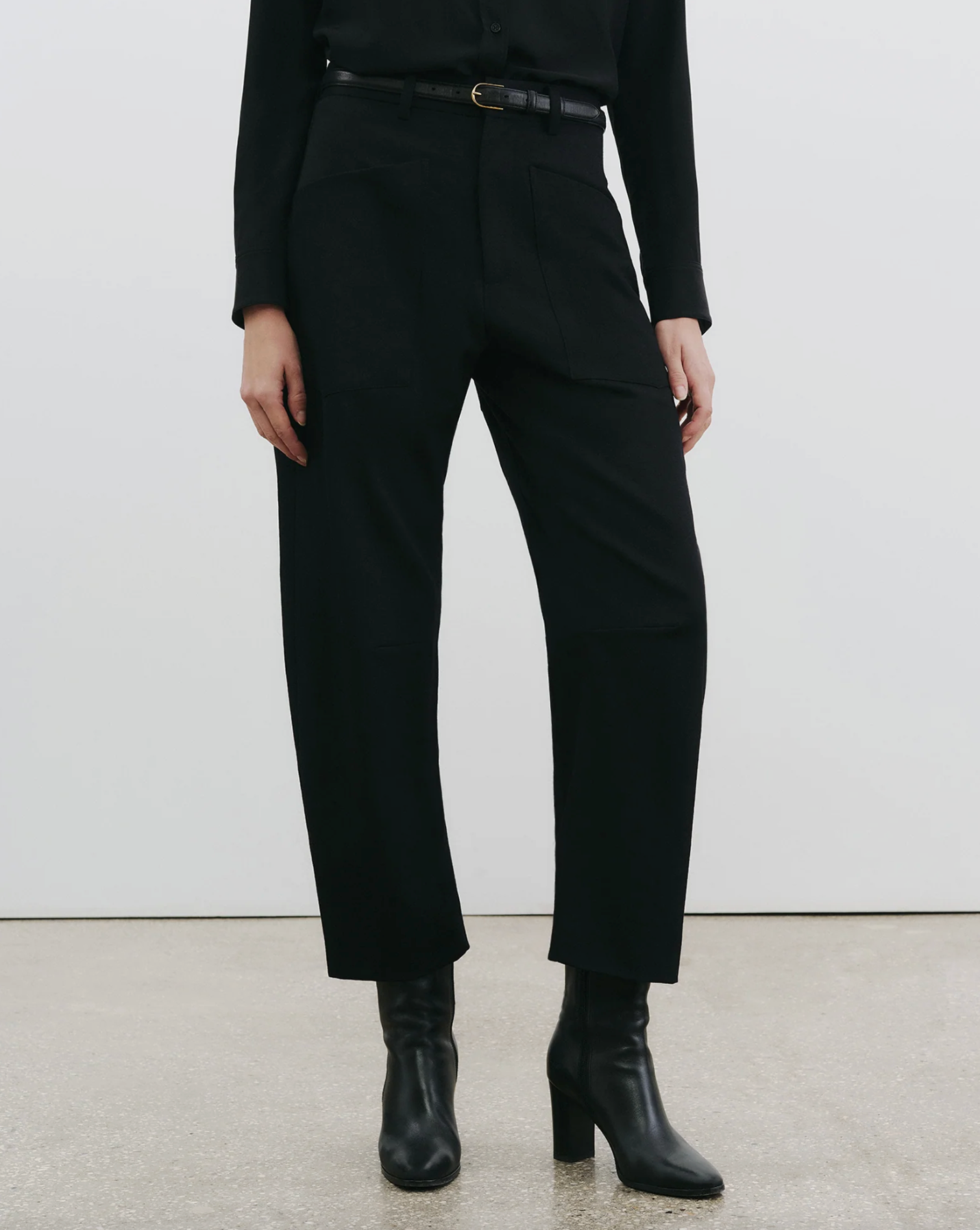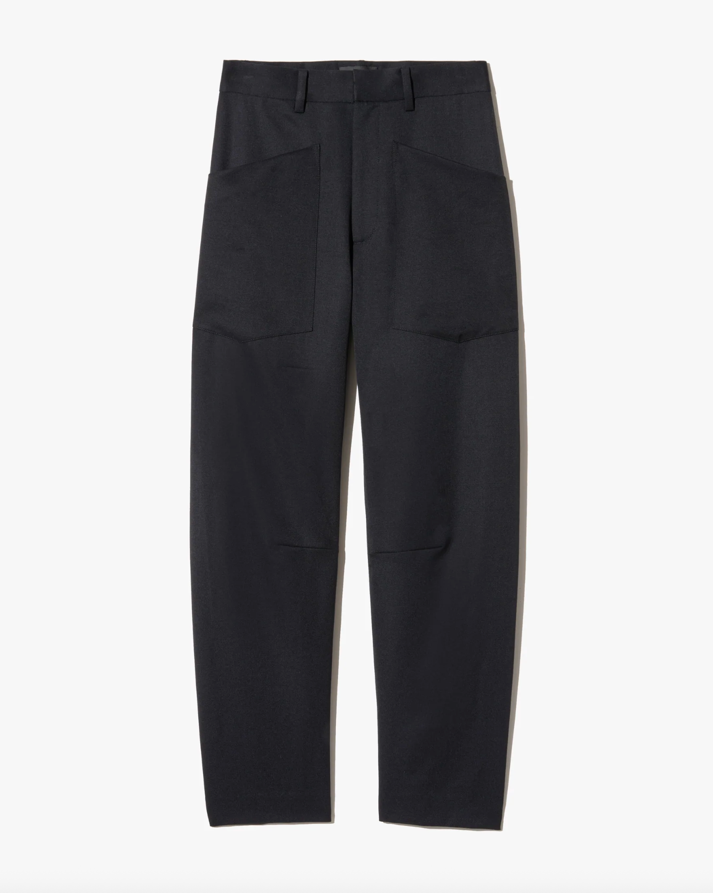Mid-rise, relaxed fit barrel leg pant. Uniquely curved silhouette. Seam detail at knees. Gusset at inseam. Zip fly. Hidden hook-and-bar closure. Hidden stay button closure. Top-stitched front and back patch pockets. Belt loops.