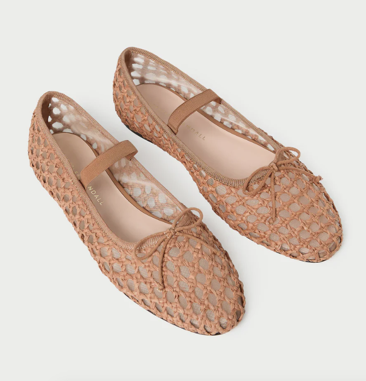 Soft ballet flat in brown crocheted raffia with an elastic bridge strap and bow detail. Features a padded footbed with gold stamped logo and an almond toe.