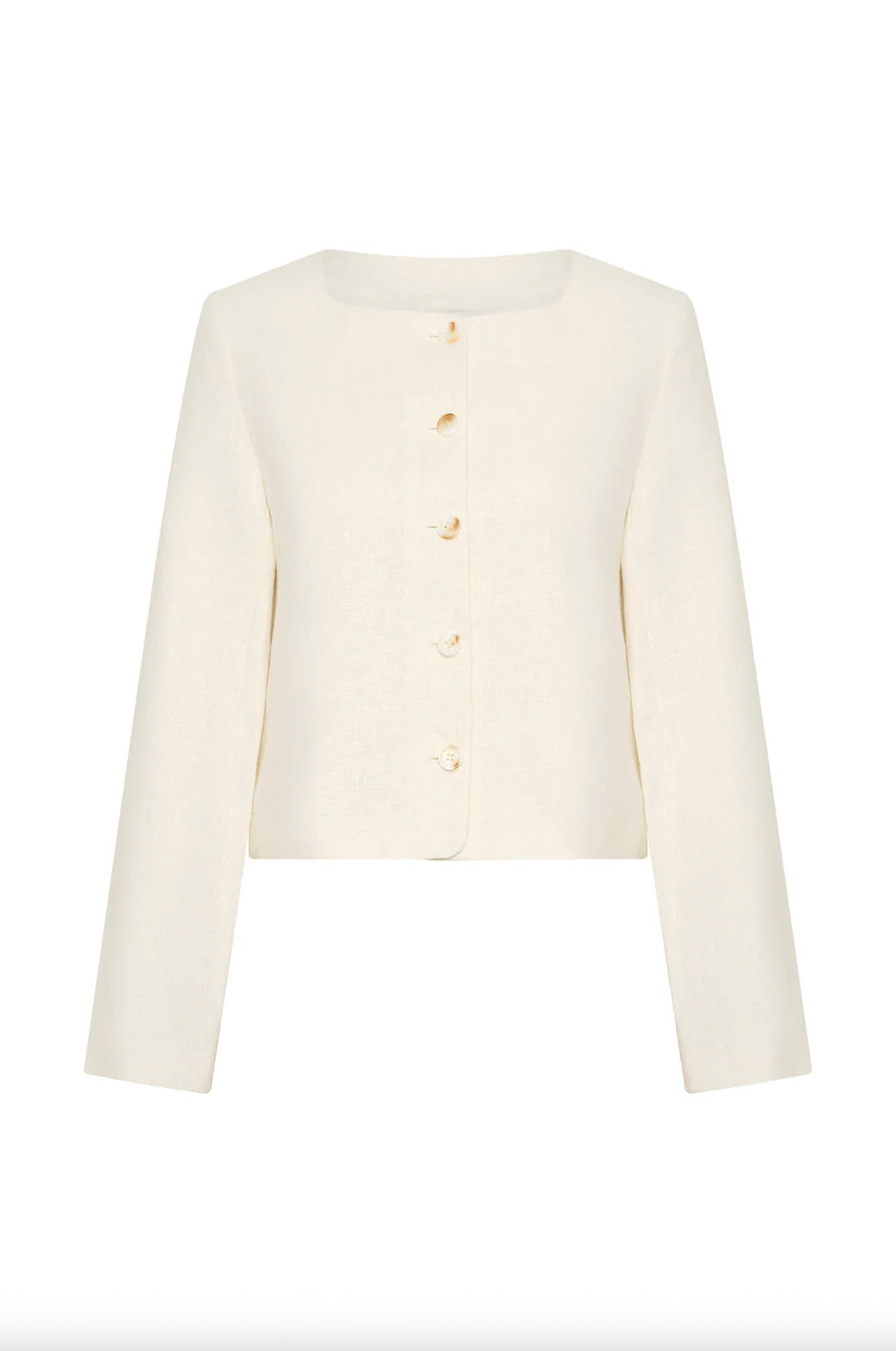 Cut from hand-loomed linen, the Emma Jacket has a boxy fit with an elegant high neckline and softly padded shoulders. It fastens with chic mottled buttons.