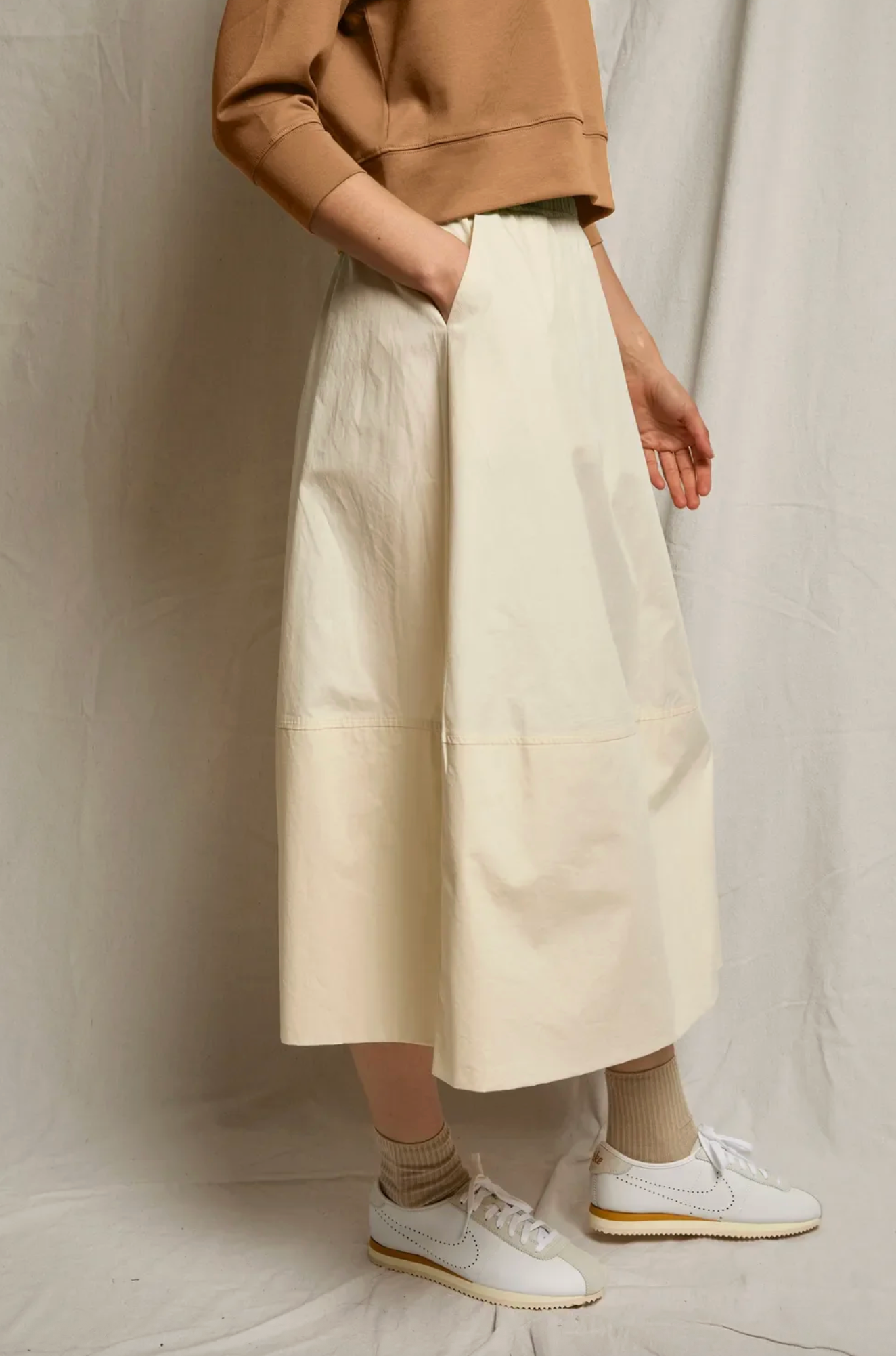 The Minka is a crisp cotton poplin a-line skirt that features a subtle, slightly dropped waist for a contemporary silhouette. With its clean lines, pull-on waist and hidden side pockets, it balances structure with everyday ease, making it a versatile piece for any season.