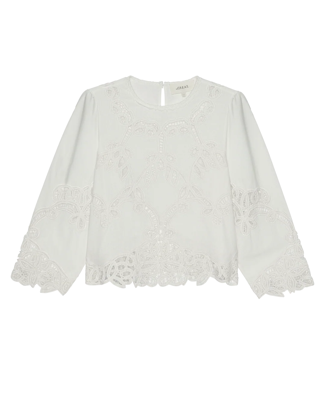 The Picnic Top is cut from structured cotton with a soft hand. The allover lace recreates Battenburg lace, a decorative technique from the late 19th century, constructed by basting woven tapes onto fabric and joining them with ornamental needle stitches. The fit is loose and easy with a boxy silhouette and straight sleeves designed to hit just above the wrist. Finished with a crew neckline trimmed in crochet lace and a back keyhole closure with button and loop.