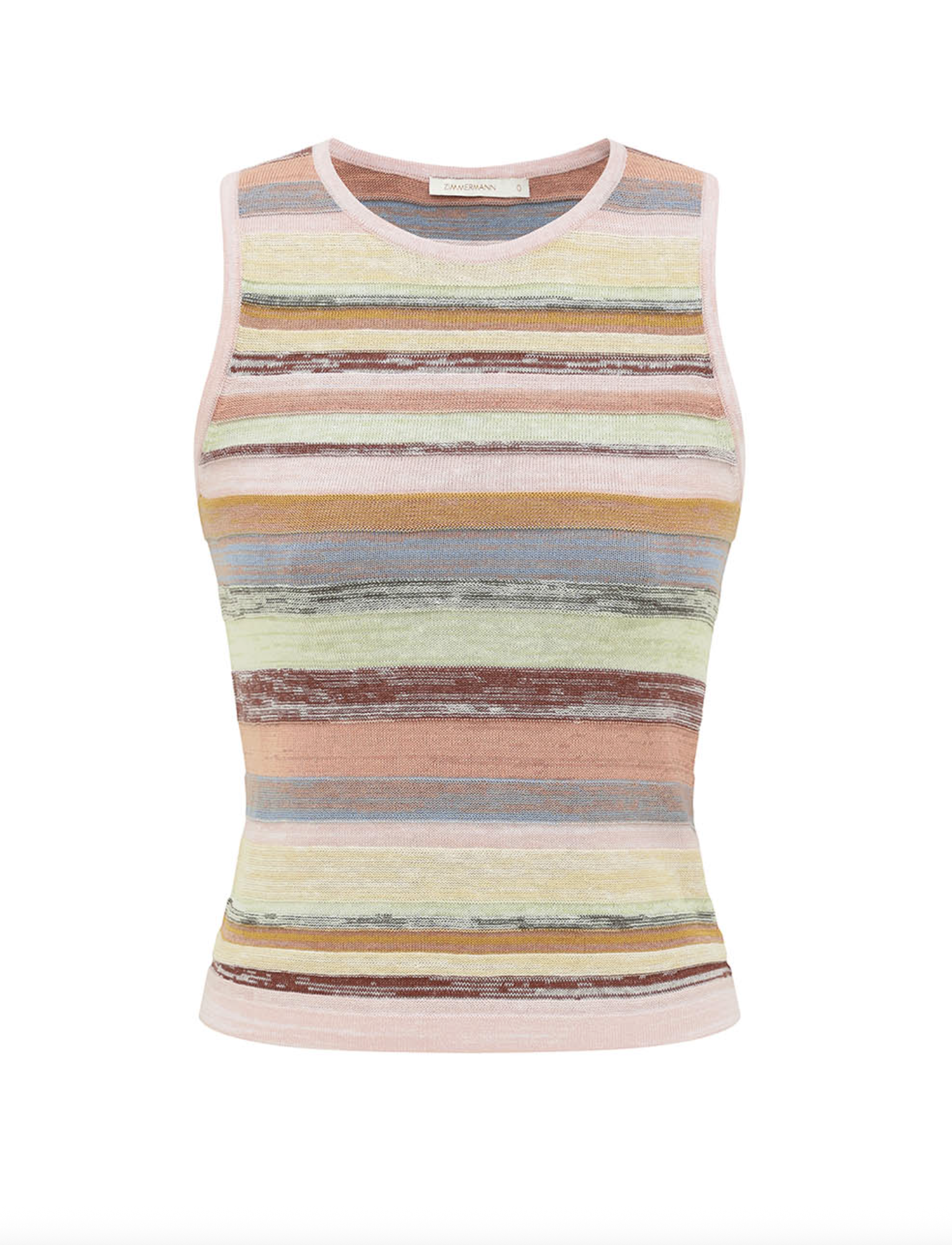 The Luna Mouline Racer Tank in Multi Stripe from the Zimmermann Spring 2026 Collection, Kindred Spirit. A cotton-linen tank top featuring a high crew neckline, racer back and contrasting stripes throughout.