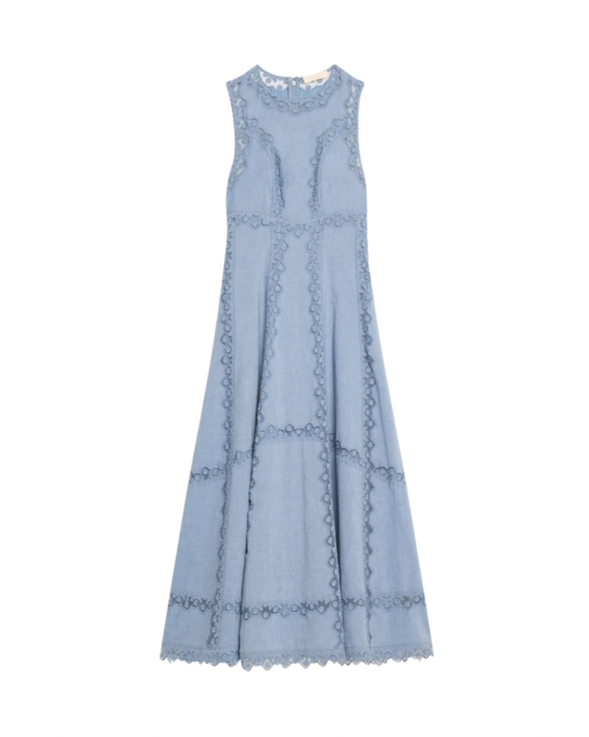 The Anela Dress is made from soft, water-washed cotton that’s enlivened by geometric ribbon embroidery and tulle appliqués for a play on transparency. A sleeveless silhouette that skims the form and a gently flared hemline. It is lined in the bodice and fastens with a concealed back zipper.