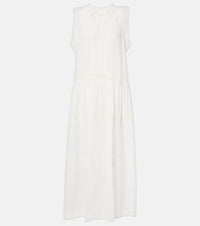An ethereal beauty, the Thalia Coverup is made from pearly white cotton that comes alive with hand-crocheted panels evocative of delicate lace. This voluminous coverup is sleeveless, has neckties, and unfurls to a maxi length.